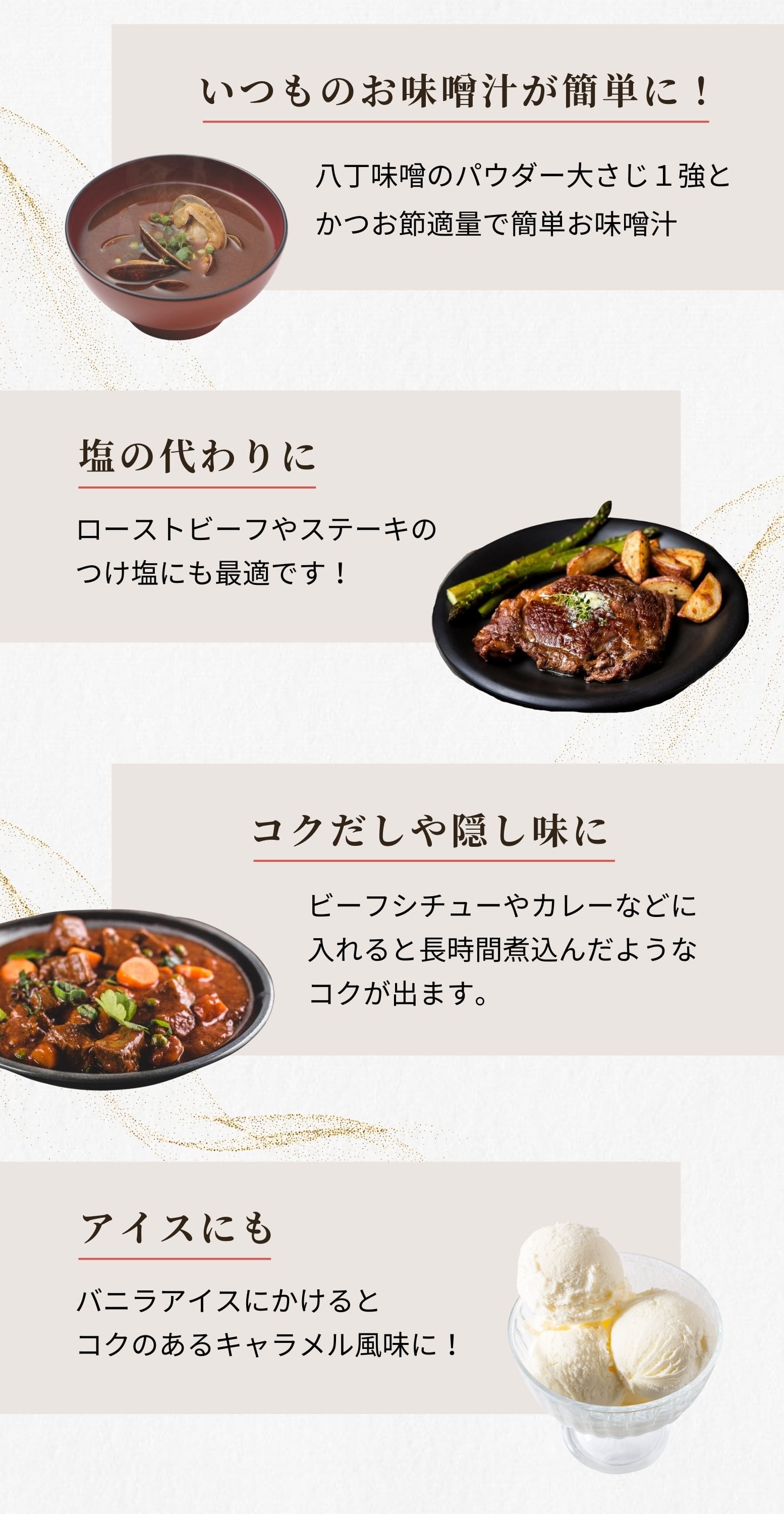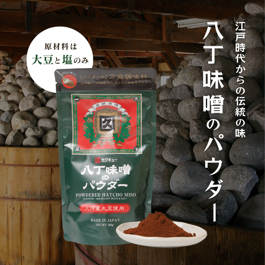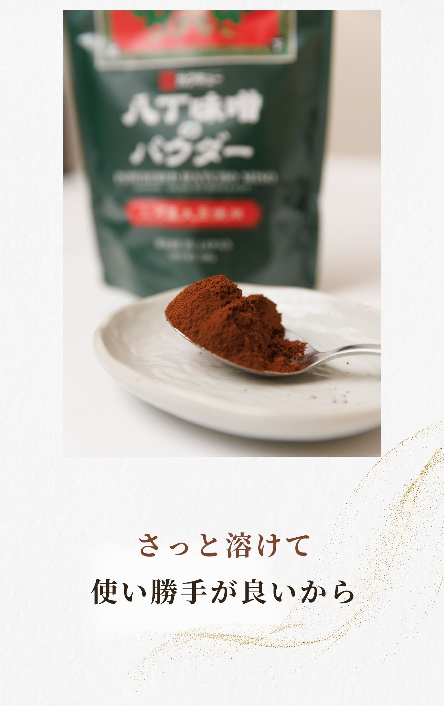 フリーズドライ製法で「三河産大豆 八丁味噌」の風味と栄養をギュッと凝縮し、使いやすい粉末タイプにしました。サッと溶けて料理のコクを引き出し、素材の美味しさを際立たせます。ふりかけ感覚で手軽に使え、小麦粉などの粉ものにもなじみやすいので、アイデア次第で幅広いレシピに活躍!