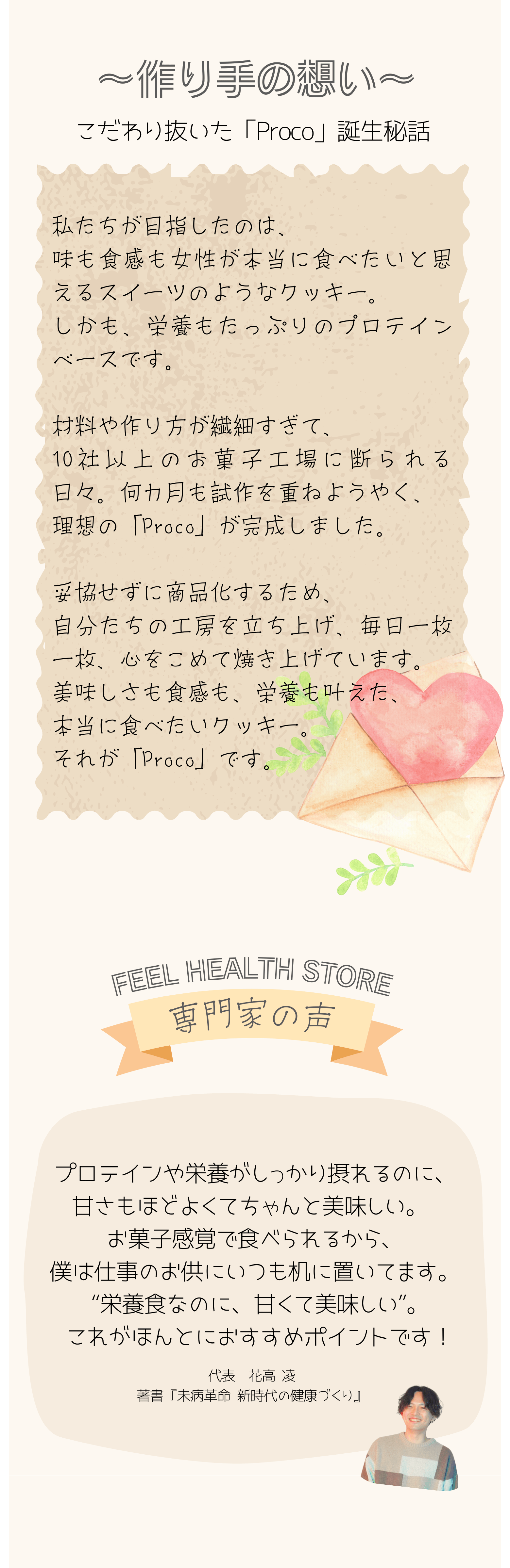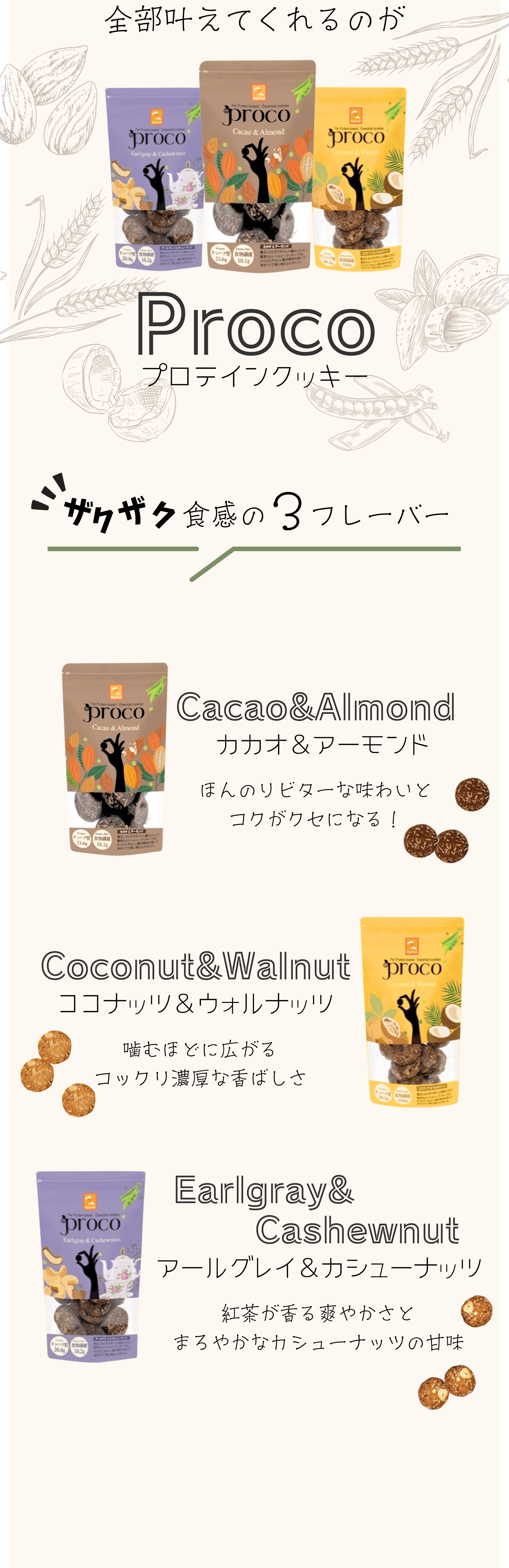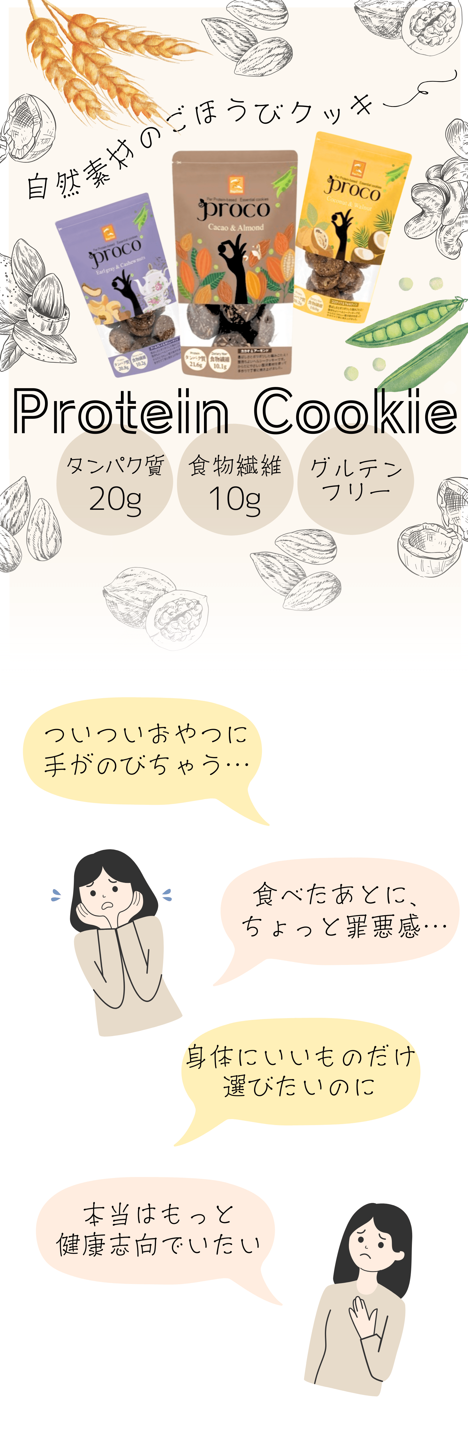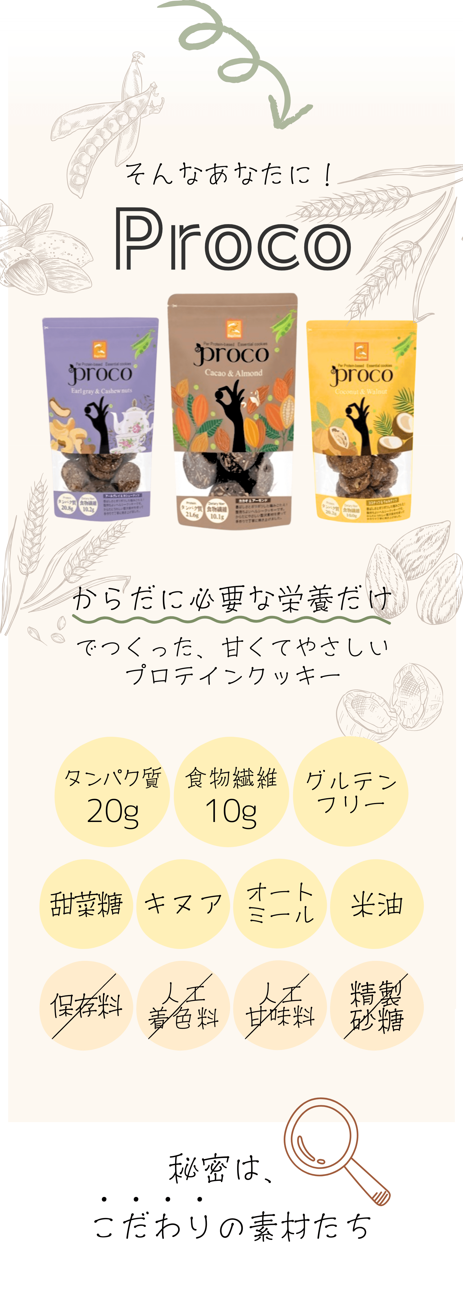 「Proco」は、からだに必要な栄養を含む食材だけでつくった、手作りのプレミアム・エッセンシャルクッキーです。