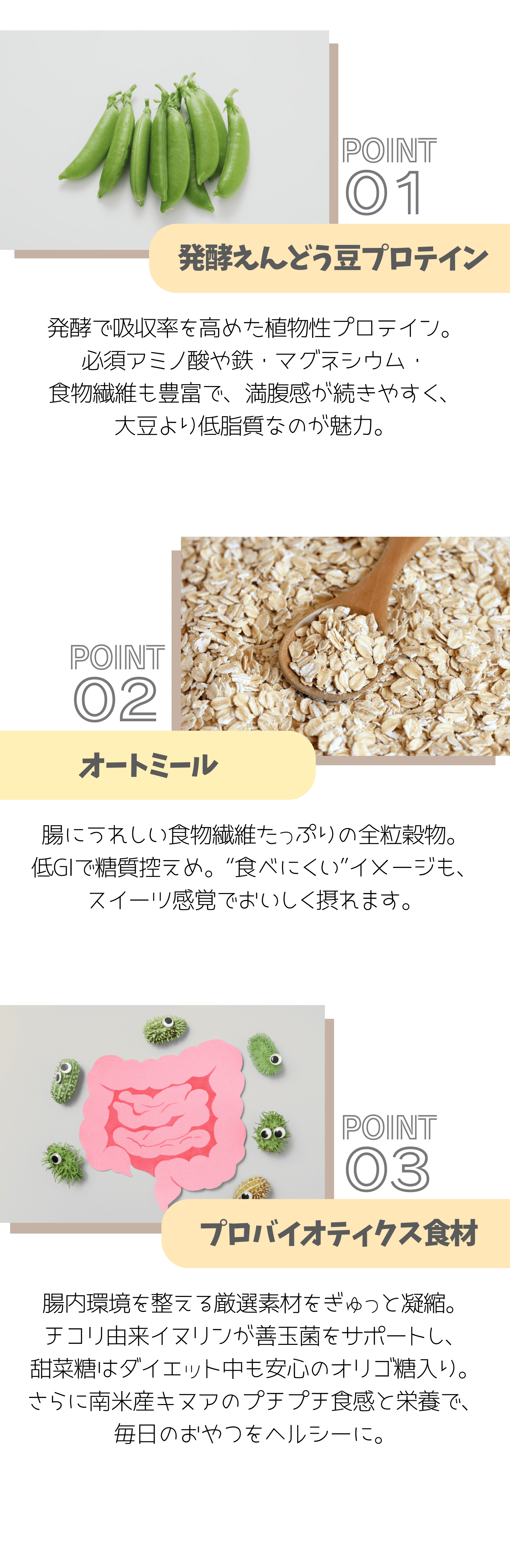 発酵えんどう豆プロテインを使うことで吸収率を高め、イヌリン・キヌア・甜菜糖など腸にうれしいプロバイオティクス食材もプラスしました。