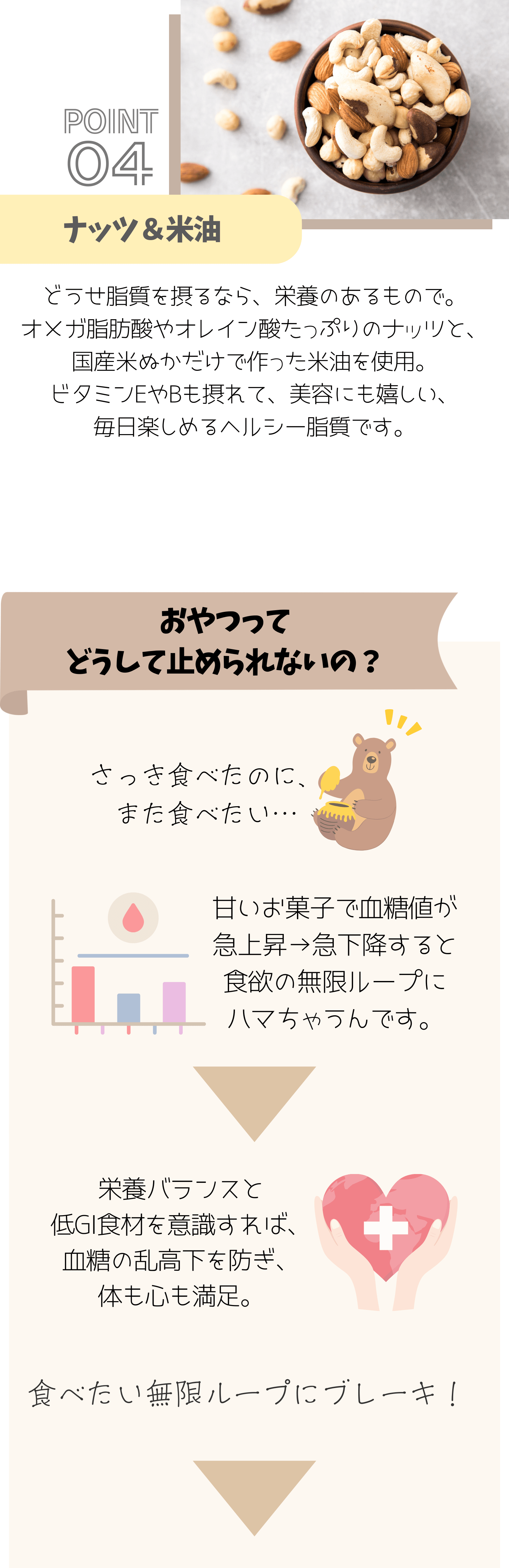 さらに、ナッツと米油の良質な脂質で、栄養バランスにもこだわっています。